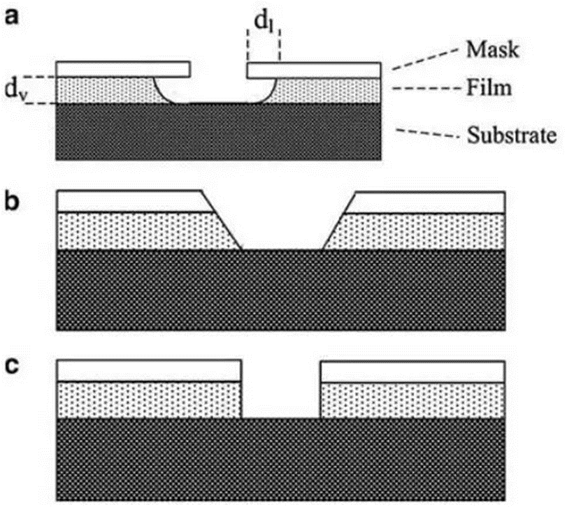注:湿法刻蚀引起侧蚀,使得刻蚀不能精确控制尺寸,而干法刻蚀(等离子刻蚀)则可以选择性刻蚀。刻蚀类型有三种,分别是各向同性刻蚀(图2a)、斜向刻蚀(图2b)和垂直刻蚀/各向异性刻蚀(图2c). (a). 各向同性刻蚀