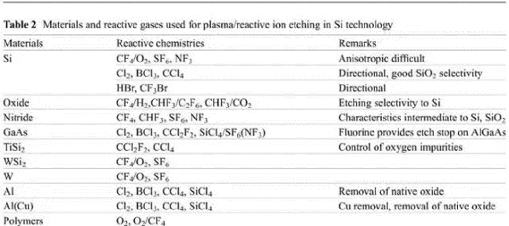 单晶硅以外的许多材料也可以通过等离子刻蚀方法进行处理,比如:多晶硅、氮化硅(SiNx)、氧化硅、玻璃、化合物半导体、金属、硅化物和聚合物等。处理不同的材料用到的反应气体也不一样,也可以用个混合气体来得到特定的刻蚀选择比。表2是不同材料所用到的反应气体。