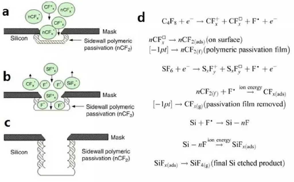 (c).经历四次循环刻蚀后的轮廓;(d).参与反应过程的详细化学方程式。