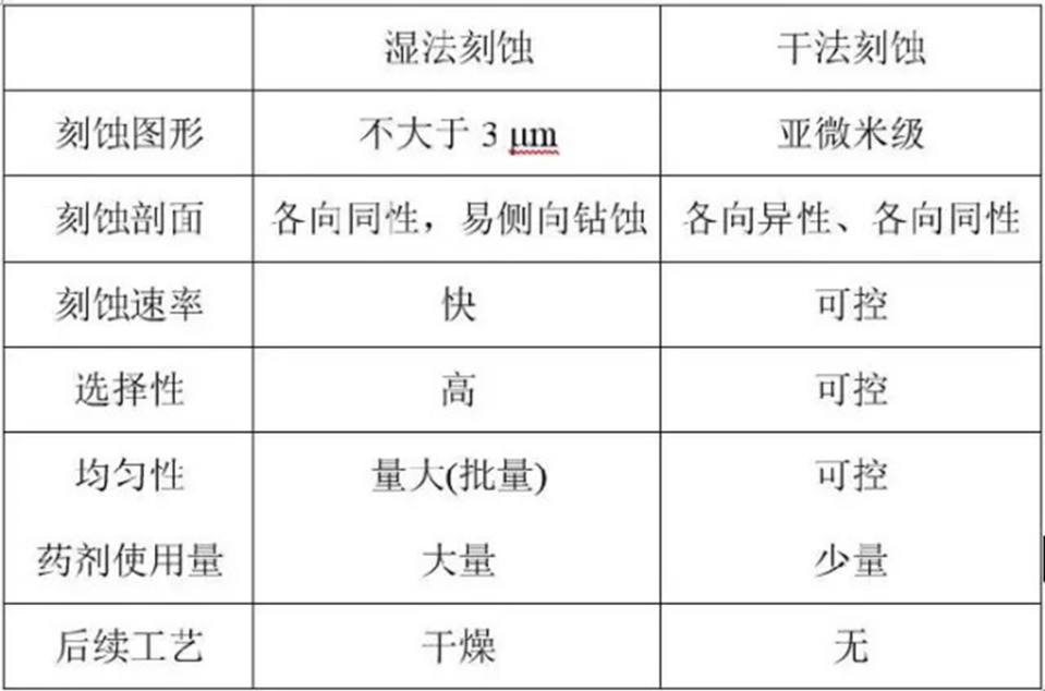 表1:湿法刻蚀和干法刻蚀性能对比