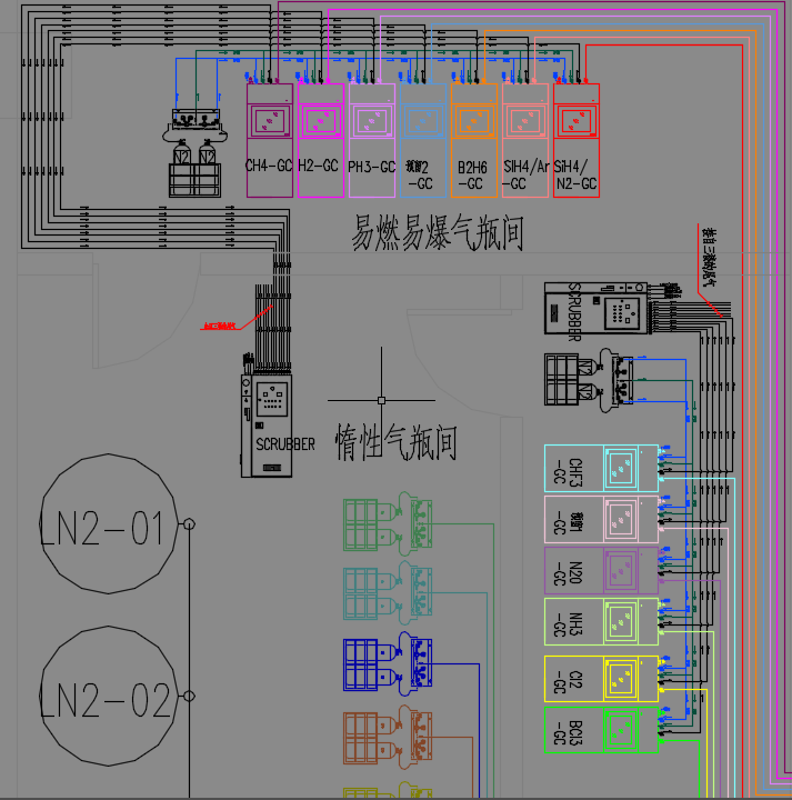 特气系统,尤其是集中供气系统引入国内的时间并不长,相应的设备、施工方法、经验多是从欧美等发达国家延伸而来。我们可以参考美国ASTM给出的相应标准,目前国内标准也在逐步完善当中。随着半导体行业如火如荼的发展,越来越多的特气设备也引入我们自己的生产线中,在多设备引入时建议不相容GR应布置在不同房间里,当由于条件所限布置在同一房间时,GR之间的距离应大于6M。同时具有可燃性和毒性的气体设备应该放置在可燃性气体间。GR、GC、Scrubber等设备宜靠墙布置,具有相同性质的设备应该布置在一起。特种气体房间内的中间通道宽度不得小于2M。GC与墙体之间的距离宜大于0.1M,GC之间距离宜大于0.1M。各类设备布置应该预留维修和运转空间。长管拖车、ISO标准集装瓶组等大型设备宜放置在室外空旷平地。
