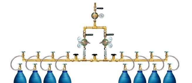 气体汇流排指瓶装高压气体,通过此设备减压到一定的使用压力,是集中供气体的一种设备。汇流排由左右两根汇流主管道组成,中间有四只高压阀门,分别控制左右两组汇流管,每组有相当数量的分阀,软管及卡具连接气瓶,中间装有一块高压表,用来检测汇流管内的压力,高压阀门上方分别有两组减压器,以便控制调节使用压力及流量,减压器上方分别有两只低压阀门,用来控制两排汇流切换时的低压气体,汇流低压主管道装有一只低压总阀门,用来控制低压管道的气体