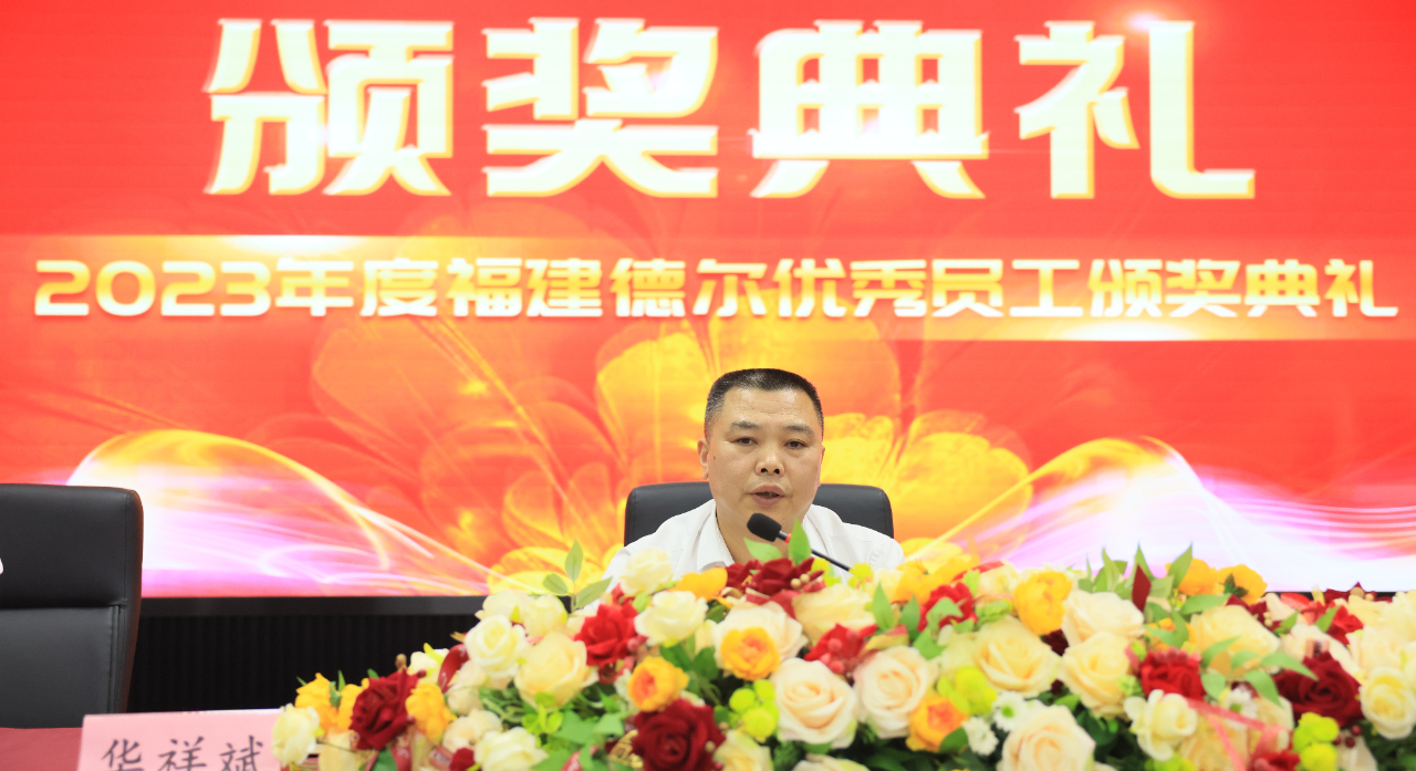 表彰仪式的最后,董事长华祥斌先生作总结致辞。他感谢所有获得者在过去一年当中的辛勤奉献,希望他们在各自的岗位上继续发挥模范带头作用,促进安全高效生产,为福建德尔发展赋能,以实际行动在今后的工作中再创佳绩。